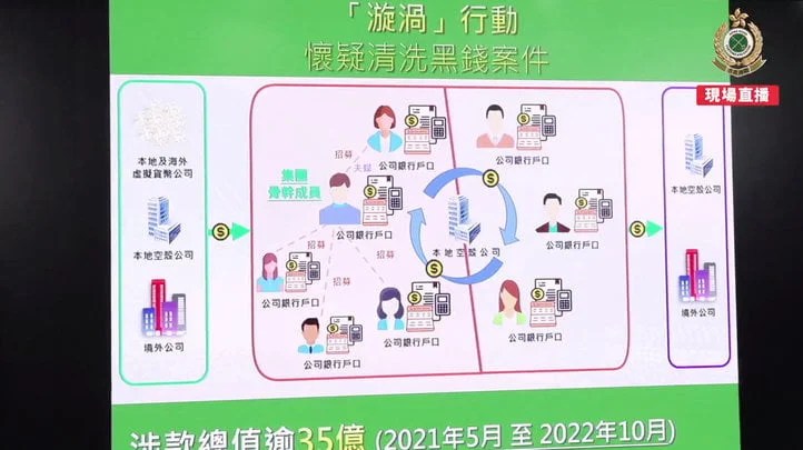 海关指,自去年中锁定一名54岁女子有怀疑洗黑钱活动,发现她和集团另外4名成员,在极短时间内成立空壳公司,在1年半内接收虚拟货币公司、本地空壳公司及境外公司汇入共29亿元来历不明的款项,然后利用公司户口,以多重转帐方式进行洗黑钱。