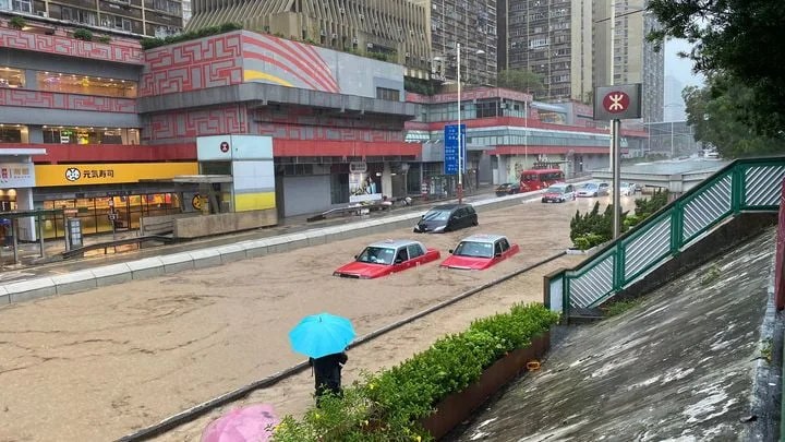 受暴雨影响,九龙塘一带严重水浸,大量雨水从雨水渠涌出,东铁站对开的根德道和多福道有如水塘和河流,车辆未能通过。有汽车在歌和老街死火,有路人涉水而行。东铁站地面亦淹浸,垃圾桶漂浮。