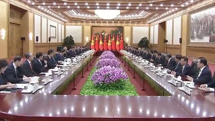 习近平又指,作为当今世界两个执政的共产党,中越两党要秉持友好初心,赓续传统友谊,牢记共同使命,坚持共产党领导和社会主义制度,持续深化具有战略意义的中越命运共同体建设,共同促进世界社会主义事业发展,相信中越合作的道路一定会越走越宽广。
