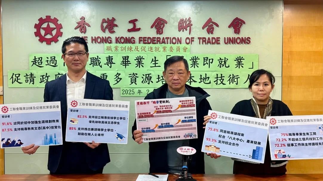工聯會去年10至12月,以問卷訪問120名職專教育學生,了解本港職專教育發展路向,發現近90%人認同,校方應加強支援初中生的生涯規劃、逾80%人期望新增銜接學士學位的職專課程,並優先取錄相關高級文憑學生。