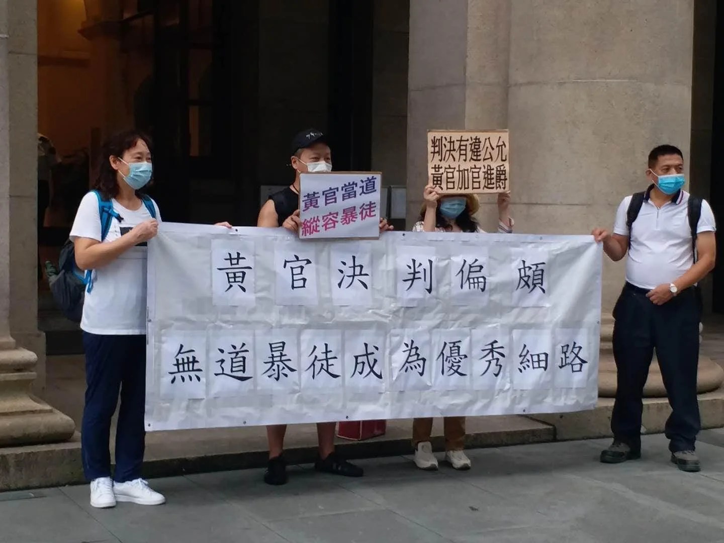 多個團體和市民下午到終審法院請願,向終院首席法官馬道立遞交信件,投訴裁判官何俊堯在多宗案件的審理之中歪曲事實焦點,緃容暴徒。