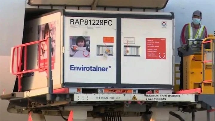 首批100萬劑科興新冠疫苗下午5時半左右由北京運抵本港,運載疫苗的國泰航空CX391航班,抵達赤鱲角機場後,工作人員隨即卸載7個裝載疫苗的大型凍櫃。公務員事務局局長聶德權、食物及衞生局局長陳肇始、中聯辦副主任仇鴻、機管局行政總裁林天福及機管局主席蘇澤光於機場停機坪迎接。