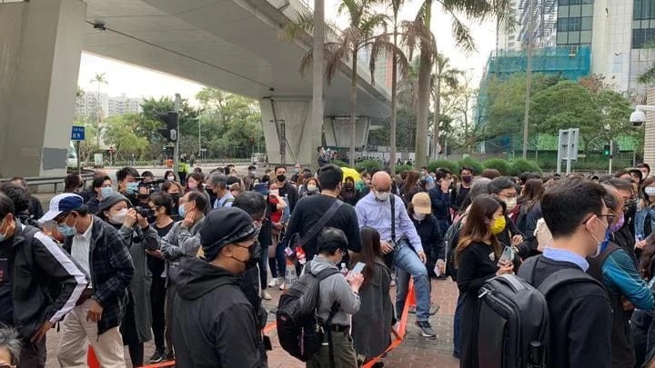 由于案中被控的人数众多,到庭准备旁听的市民亦十分挤拥,法庭公众席已派完所有筹。有支持者拉起写有“释放政治犯”的标语,亦有反对者举起支持国安法的横额,警方在现场架起铁马分开两批人。