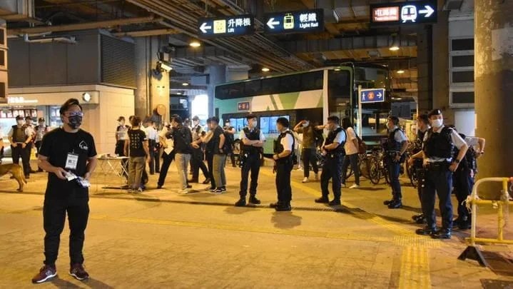 2名香港酒店工会成员,下午2时许在元朗站地下摆街站,派发写有721字眼的防疫单张,被警方截查,指单张上的卡通图案与“黑暴”有关,如果不停止派发,会通知国安处人员到场调查,他们最后离开。