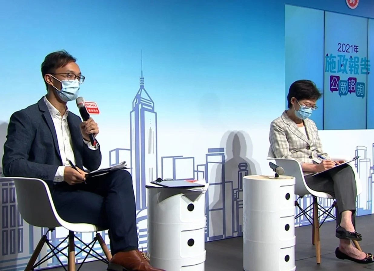 行政长官林郑月娥出席施政报告咨询会,指本港经历两年黑暴及疫情的严峻挑战,市民对未来有更大期盼,又指中央落实港区国安法及完善选举制度,令香港可长治久安,未来行政立法关系互相配合及制衡。