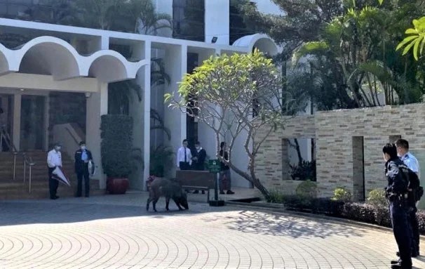 叶刘淑仪昨晚在社交媒体发文及上载图片,指出继日前有野猪经海边闯入行黄竹坑乡村俱乐部后,昨日再有一头野猪从正门进入乡村俱乐部,并在多处徘徊,该处会员不敢上前接触,最后由管理员报警求助,警员及渔护署职员到场接走野猪,平息事件。