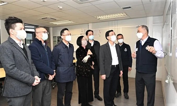政务司长李家超今日到竹篙湾检疫中心实地视察,指运作基本畅顺,已落实一系列改善措施,人手由600人增至约1000人,并由民安队资深熟练人员负责将检疫人士的资料输入电脑,每晚复核记录;卫生署亦新增24小时特别热线,让检疫人士查询离营安排。