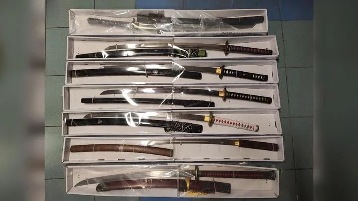 警方在元朗搗破懷疑武器倉庫,拘捕兩人。元朗警區反三合會行動組,昨晚突擊搜查上攸田村一個村屋單位,搜出35把日本武士刀及長刀、15把匕首、6把彈叉及一袋鋼珠,拘捕單位內1男1女,分別59及50歲,涉嫌藏有攻擊性武器,正被扣留調查。