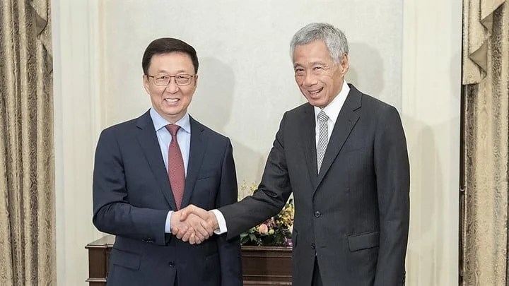 到訪新加坡的國務院副總理韓正,先後會見總統哈莉瑪及總理李顯龍等新加坡領導人,並同副總理王瑞傑共同主持雙邊合作機制會議,宣佈兩國在綠色發展、數字經濟和互聯互通等領域達成19項重要成果。
