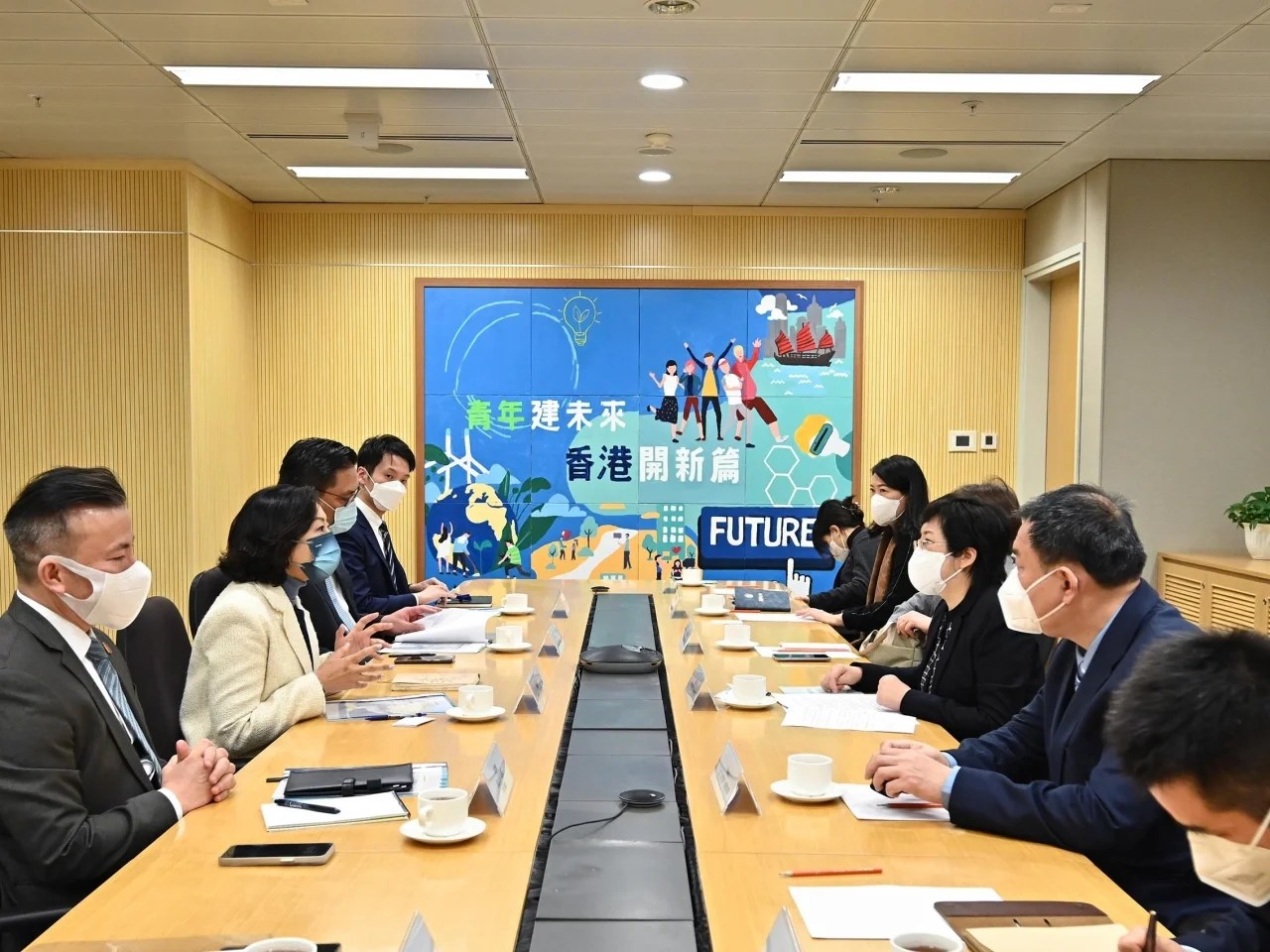 民政及青年事務局長麥美娟早上與海南省委常委、統戰部部長苗延紅率領的訪問團會面,就推動瓊港兩地青年交流合作交換意見。民青局副局長梁宏正和青年專員劉家麒亦有出席。