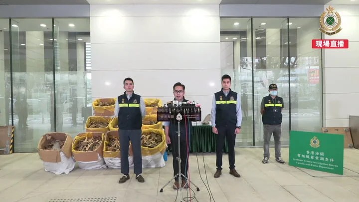 海關偵破2宗非法進口懷疑受管制瀕危物種案件,上周四在機場檢獲約270公斤乾魚肚,以及約50公斤乾魚翅,估計市值約30萬,並拘捕兩人。